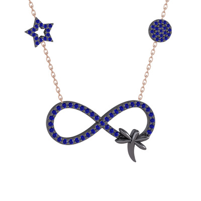 Lab safir 925 ayar siyah rodyum kaplama gümüş kolye (40 cm rose altın rolo zincir)