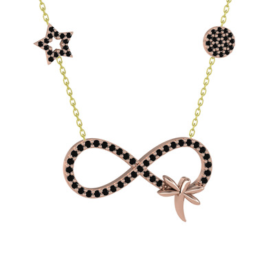 Siyah zirkon 14 ayar rose altın kolye (40 cm gümüş rolo zincir)
