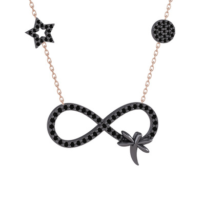 Siyah zirkon 925 ayar siyah rodyum kaplama gümüş kolye (40 cm rose altın rolo zincir)