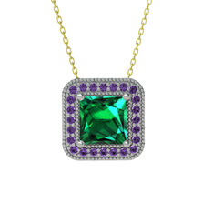 Ametist ve kök zümrüt 925 ayar altın kaplama gümüş kolye (40 cm beyaz altın rolo zincir)