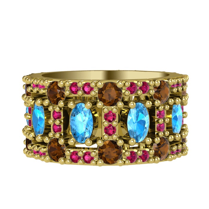 Akuamarin, dumanlı kuvars ve rodolit garnet 8 ayar altın yüzük