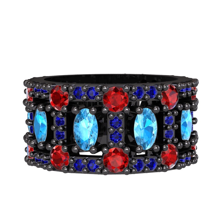 Akuamarin, garnet ve lab safir 925 ayar siyah rodyum kaplama gümüş yüzük