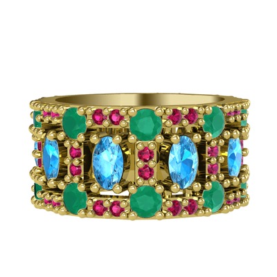 Akuamarin, kök zümrüt ve rodolit garnet 925 ayar altın kaplama gümüş yüzük