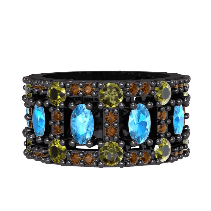 Akuamarin, peridot ve dumanlı kuvars 925 ayar siyah rodyum kaplama gümüş yüzük
