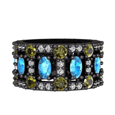 Akuamarin, peridot ve pırlanta 925 ayar siyah rodyum kaplama gümüş yüzük (0.66 karat)