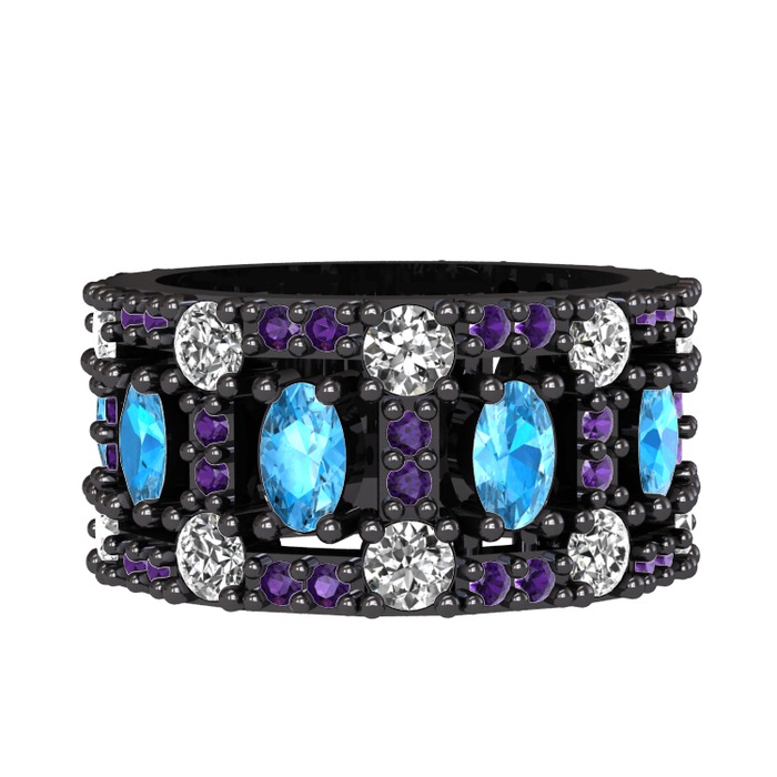 Akuamarin, pırlanta ve ametist 925 ayar siyah rodyum kaplama gümüş yüzük (1.76 karat)