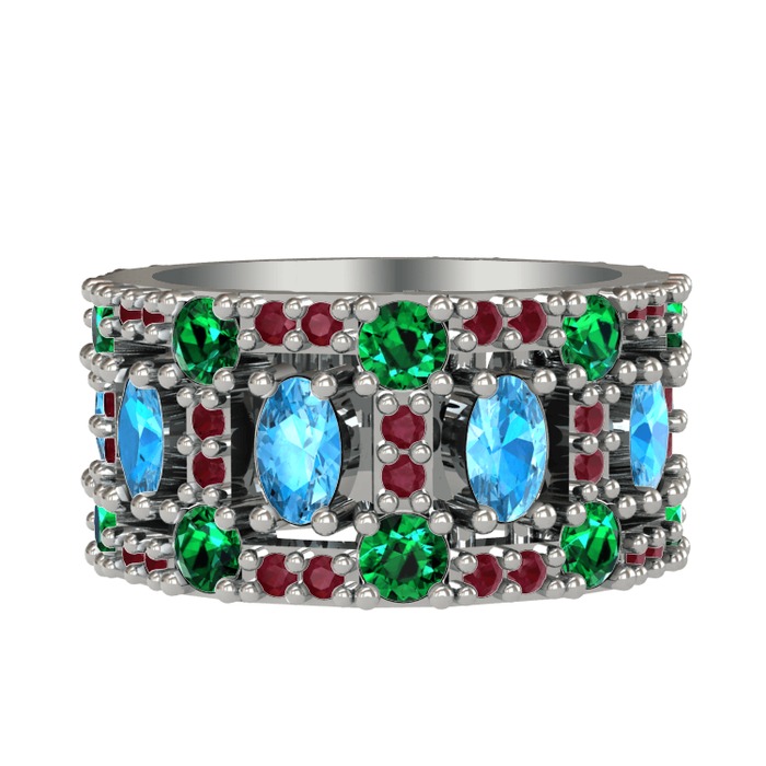 Akuamarin, yeşil kuvars ve kök yakut 8 ayar beyaz altın yüzük