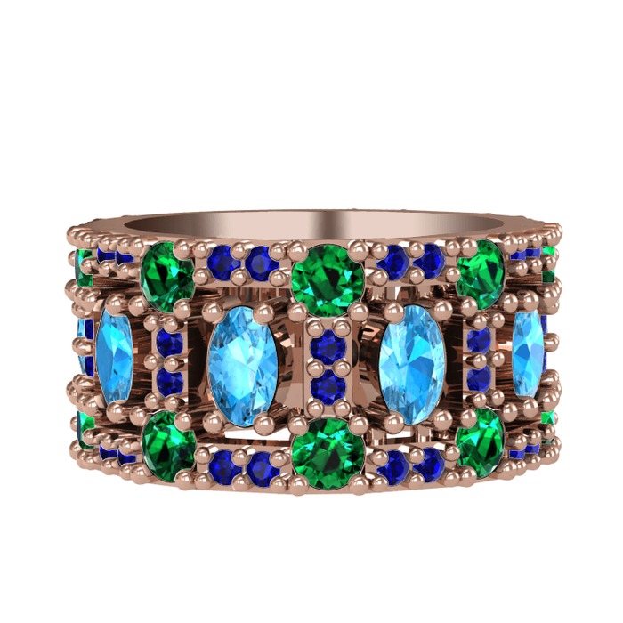 Akuamarin, yeşil kuvars ve lab safir 14 ayar rose altın yüzük