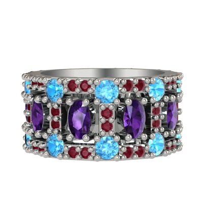 Ametist, akuamarin ve kök yakut 8 ayar beyaz altın yüzük