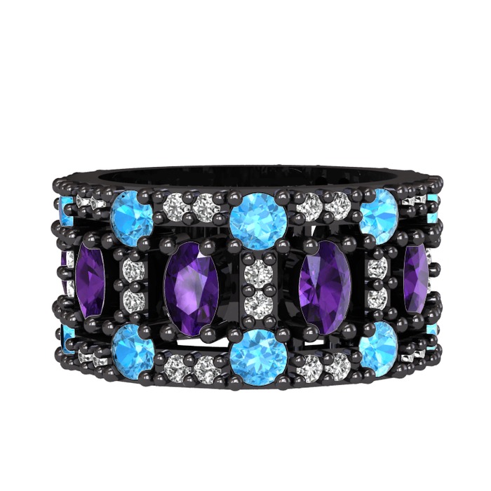 Ametist, akuamarin ve pırlanta 925 ayar siyah rodyum kaplama gümüş yüzük (0.66 karat)