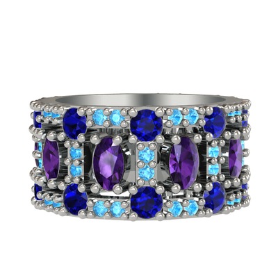 Ametist, lab safir ve akuamarin 8 ayar beyaz altın yüzük