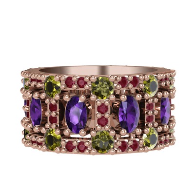 Ametist, peridot ve kök yakut 14 ayar rose altın yüzük