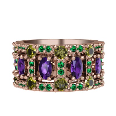 Ametist, peridot ve yeşil kuvars 925 ayar rose altın kaplama gümüş yüzük