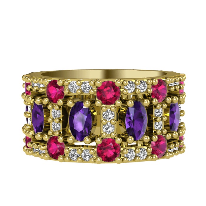 Ametist, rodolit garnet ve pırlanta 8 ayar altın yüzük (0.66 karat)