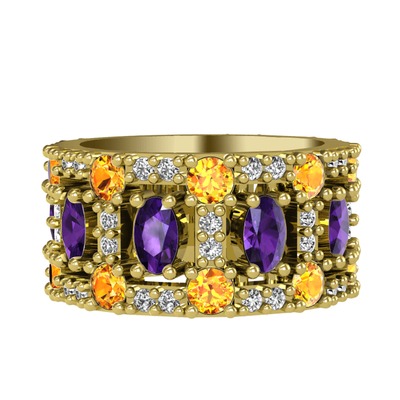 Ametist, sitrin ve beyaz zirkon 925 ayar altın kaplama gümüş yüzük