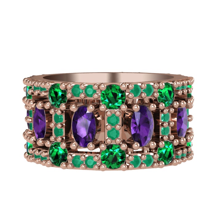 Ametist, yeşil kuvars ve kök zümrüt 8 ayar rose altın yüzük