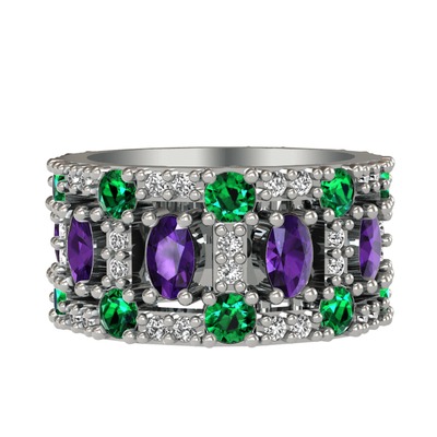 Ametist, yeşil kuvars ve swarovski 18 ayar beyaz altın yüzük
