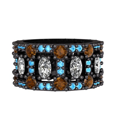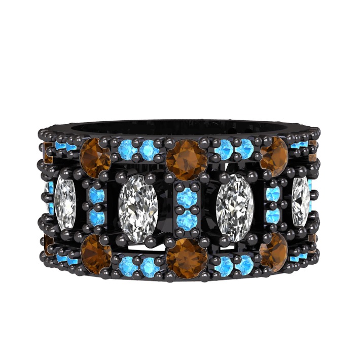 Beyaz zirkon, dumanlı kuvars ve akuamarin 925 ayar siyah rodyum kaplama gümüş yüzük