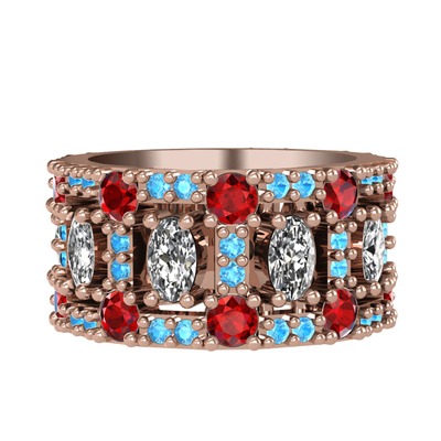 Beyaz zirkon, garnet ve akuamarin 925 ayar rose altın kaplama gümüş yüzük