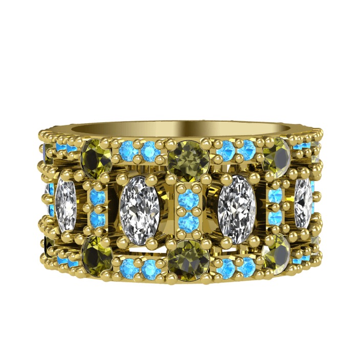 Beyaz zirkon, peridot ve akuamarin 8 ayar altın yüzük