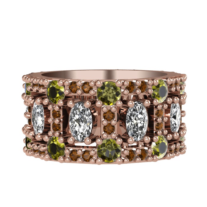 Beyaz zirkon, peridot ve dumanlı kuvars 14 ayar rose altın yüzük
