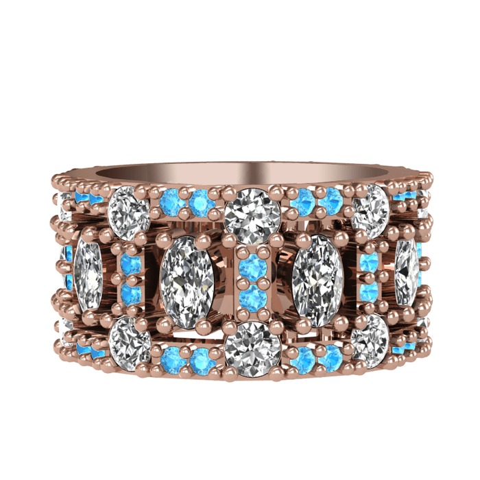 Beyaz zirkon, pırlanta ve akuamarin 925 ayar rose altın kaplama gümüş yüzük (1.76 karat)