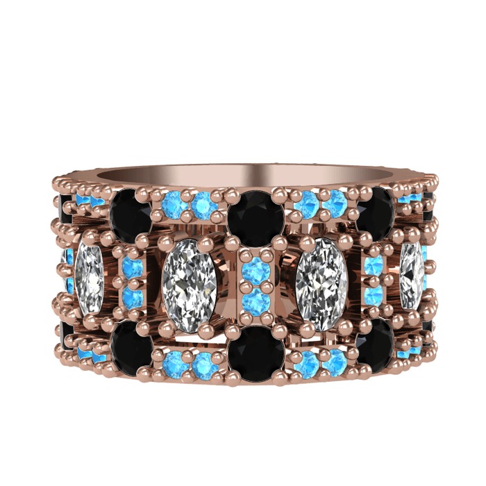 Beyaz zirkon, siyah zirkon ve akuamarin 925 ayar rose altın kaplama gümüş yüzük