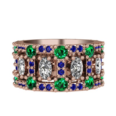 Beyaz zirkon, yeşil kuvars ve lab safir 925 ayar rose altın kaplama gümüş yüzük