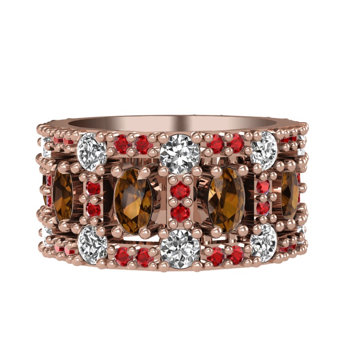 Dumanlı kuvars, beyaz zirkon ve garnet 14 ayar rose altın yüzük