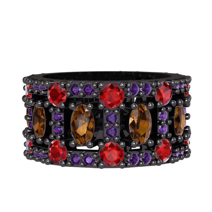 Dumanlı kuvars, garnet ve ametist 925 ayar siyah rodyum kaplama gümüş yüzük