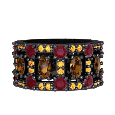 Dumanlı kuvars, kök yakut ve sitrin 925 ayar siyah rodyum kaplama gümüş yüzük