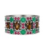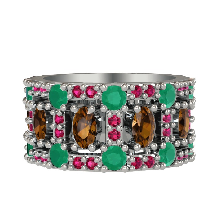 Dumanlı kuvars, kök zümrüt ve rodolit garnet 18 ayar beyaz altın yüzük