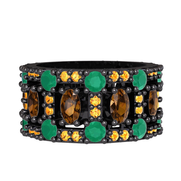 Dumanlı kuvars, kök zümrüt ve sitrin 925 ayar siyah rodyum kaplama gümüş yüzük