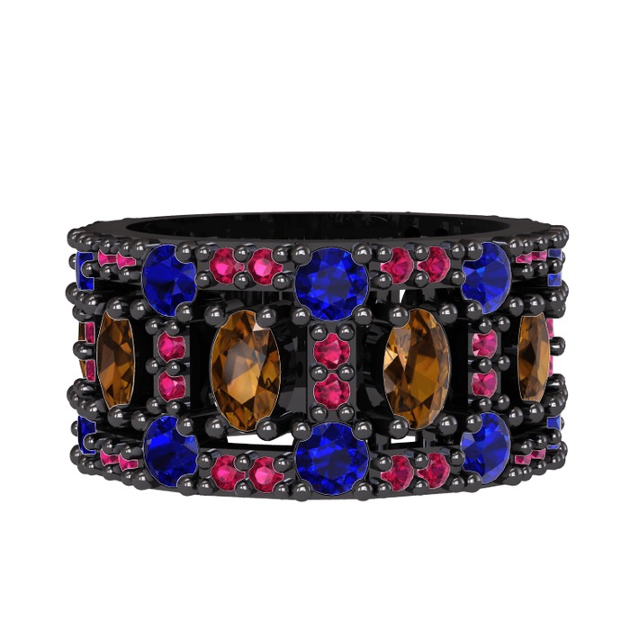 Dumanlı kuvars, lab safir ve rodolit garnet 925 ayar siyah rodyum kaplama gümüş yüzük