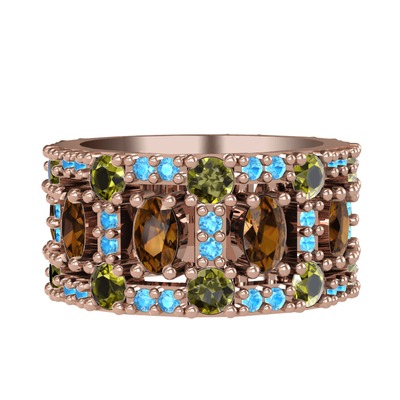 Dumanlı kuvars, peridot ve akuamarin 925 ayar rose altın kaplama gümüş yüzük