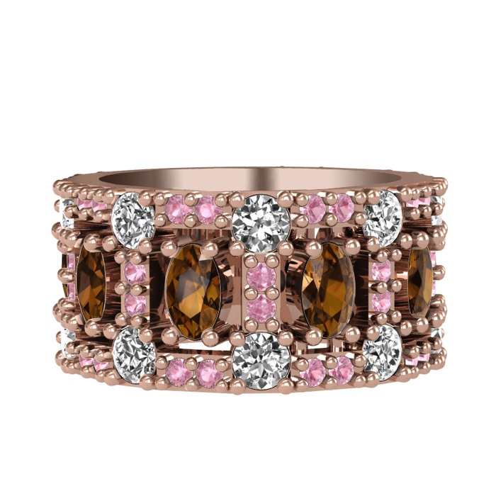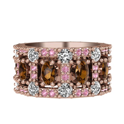 Dumanlı kuvars, pırlanta ve pembe kuvars 925 ayar rose altın kaplama gümüş yüzük (1.76 karat)