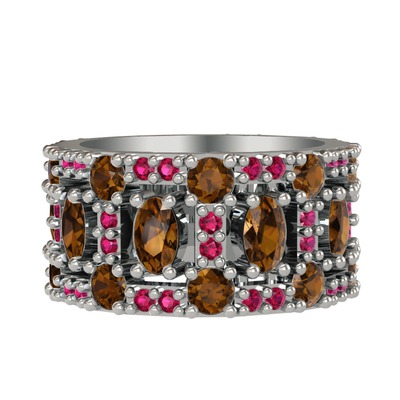Dumanlı kuvars ve rodolit garnet 14 ayar beyaz altın yüzük
