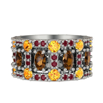 Dumanlı kuvars, sitrin ve kök yakut 18 ayar beyaz altın yüzük