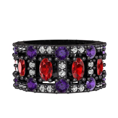 Garnet, ametist ve beyaz zirkon 925 ayar siyah rodyum kaplama gümüş yüzük