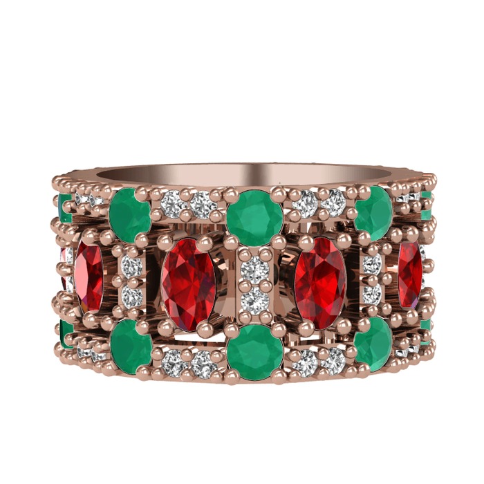 Garnet, kök zümrüt ve pırlanta 8 ayar rose altın yüzük (0.66 karat)