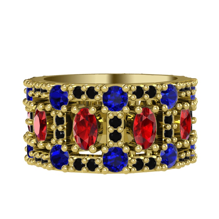 Garnet, lab safir ve siyah zirkon 18 ayar altın yüzük