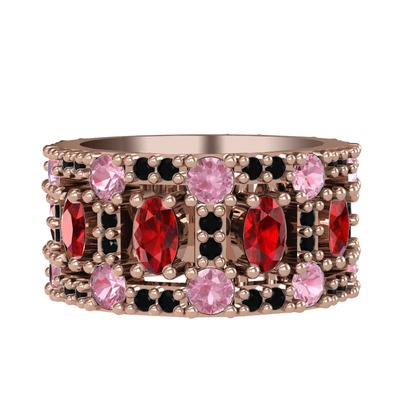 Garnet, pembe kuvars ve siyah zirkon 18 ayar rose altın yüzük