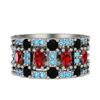 Garnet, siyah zirkon ve akuamarin 8 ayar beyaz altın yüzük