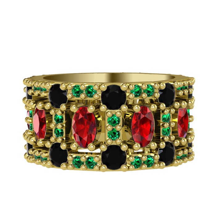 Garnet, siyah zirkon ve yeşil kuvars 8 ayar altın yüzük