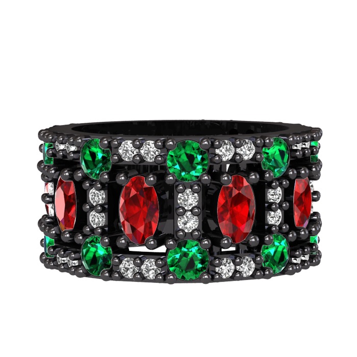 Garnet, yeşil kuvars ve pırlanta 925 ayar siyah rodyum kaplama gümüş yüzük (0.66 karat)