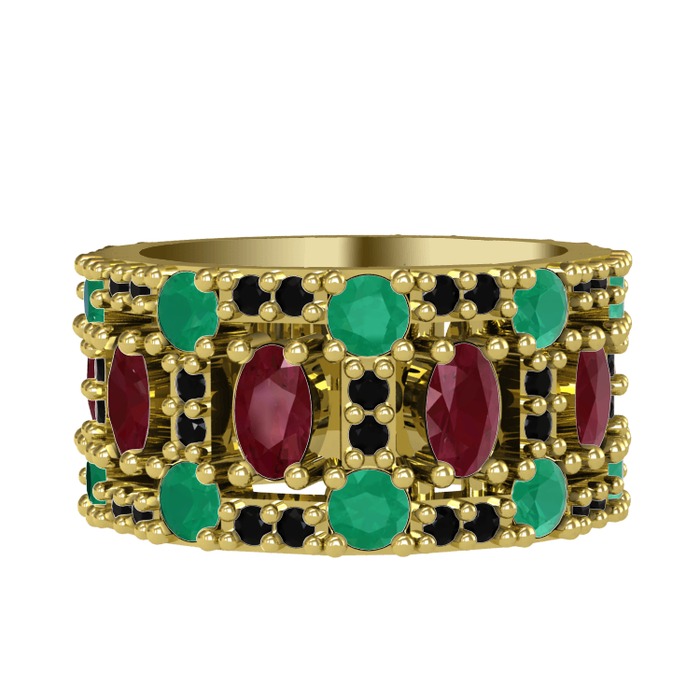 Kök yakut, kök zümrüt ve siyah zirkon 14 ayar altın yüzük