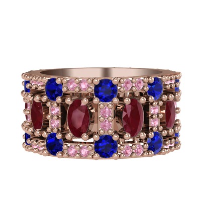 Kök yakut, lab safir ve pembe kuvars 18 ayar rose altın yüzük