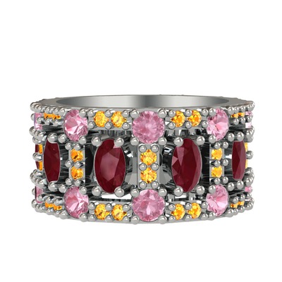 Kök yakut, pembe kuvars ve sitrin 18 ayar beyaz altın yüzük