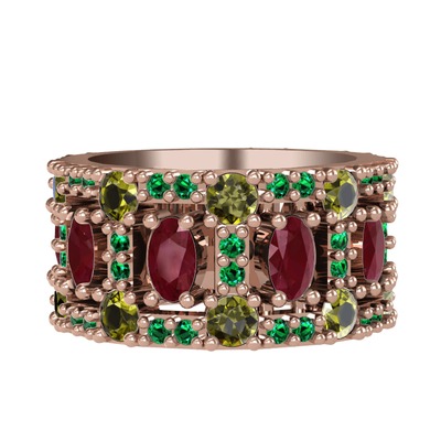 Kök yakut, peridot ve yeşil kuvars 8 ayar rose altın yüzük