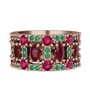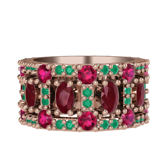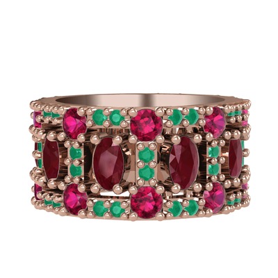 Kök yakut, rodolit garnet ve kök zümrüt 18 ayar rose altın yüzük